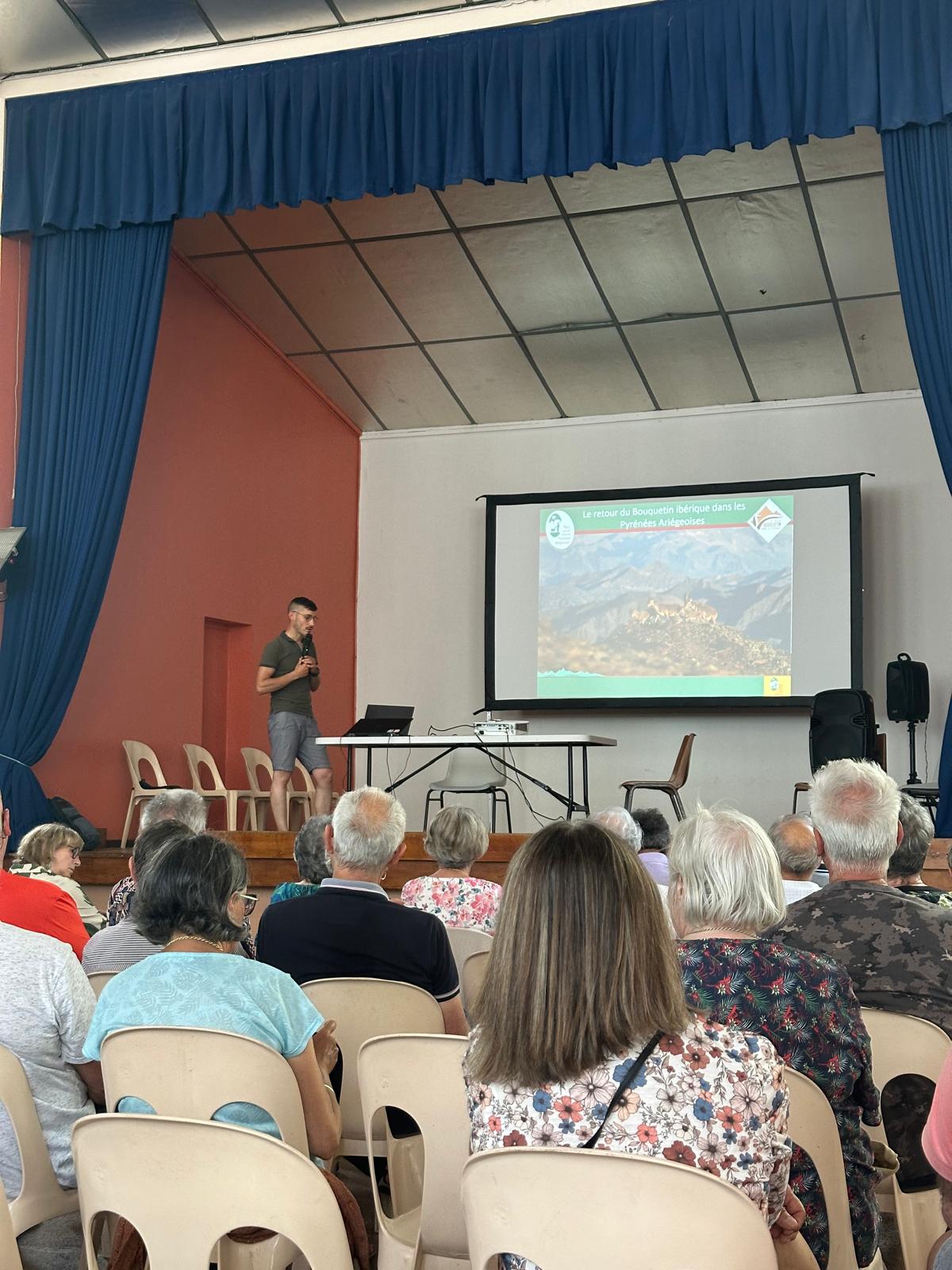 La conférence a débuté dès 16h avec une présentation de Julien Canet, photographe animalier et agent du parc naturel régional des Pyrénées ariégeoises. Son intervention, centrée sur la réintroduction des bouquetins dans les montagnes, a captivé le public, notamment grâce aux images inédites issues de pièges caméras.