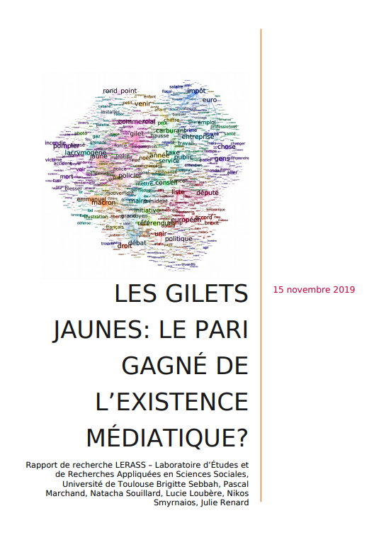 - Les gilets jaunes: le pari gagné de l’existence médiatique ? - Brigitte Sebbah, Pascal Marchand, Natacha Souillard, Lucie Loubère, Nikos Smyrnaios, Julie Renard (novembre 2019)